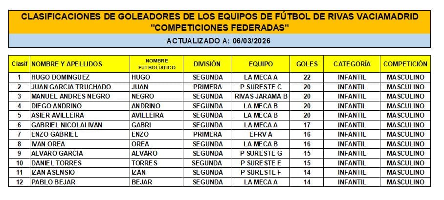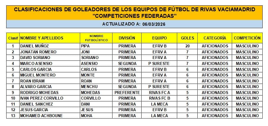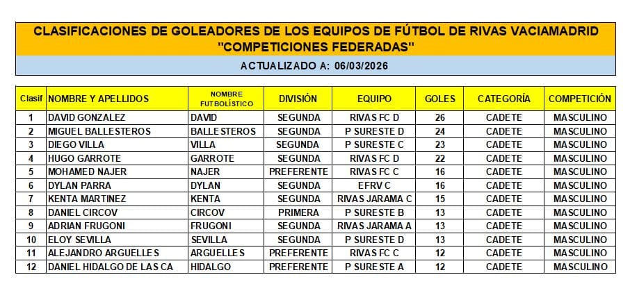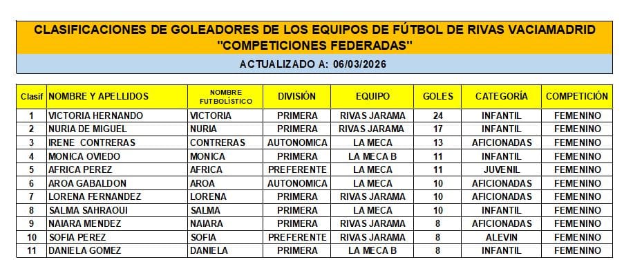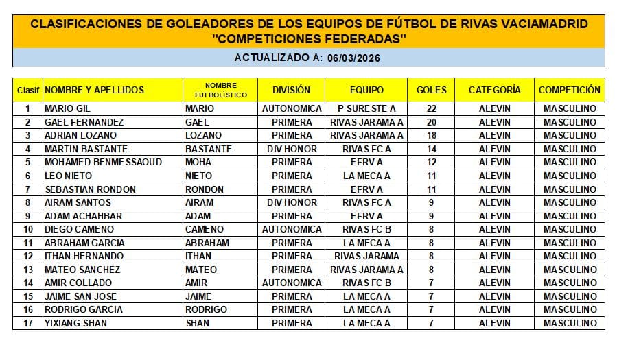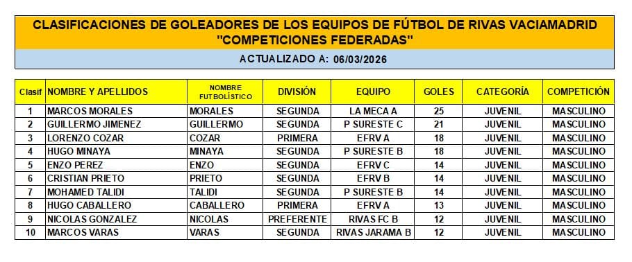 Las Clasificaciones están actualizadas a fecha del 1 de MARZO de 2026. Incluyen a los equipos federados de Rivas Vaciamadrid.