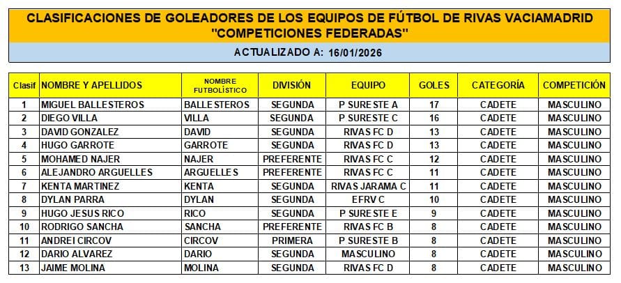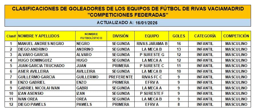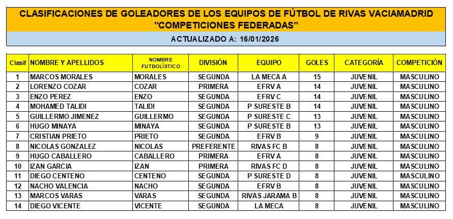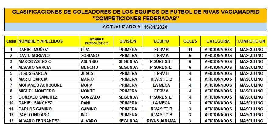 CLASIFICACIÓN DE LAS Y LOS GOLEADORAS/ES EN EL FUTBOL DE RIVAS VACIAMADRID A 12 DE ENERO/26