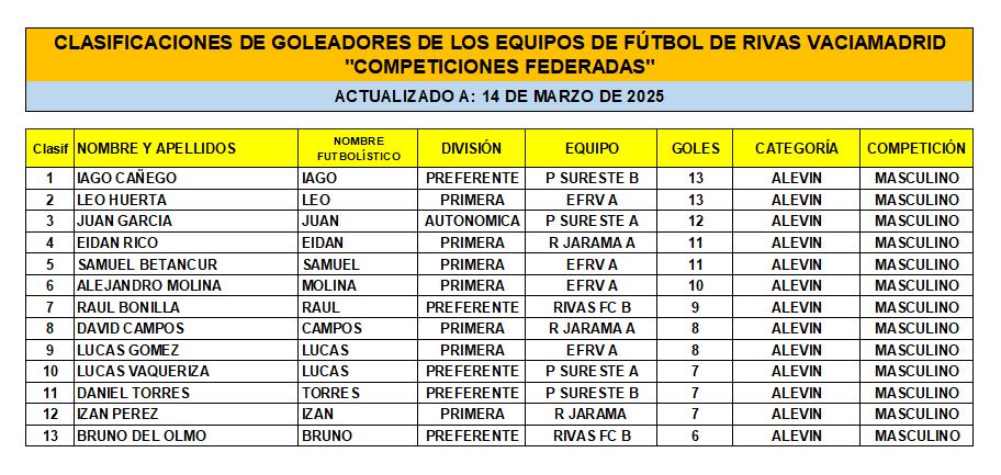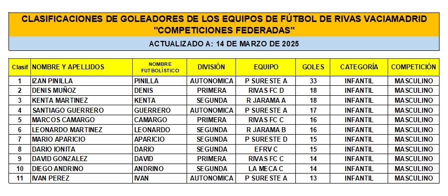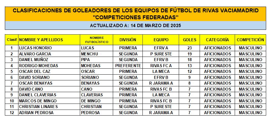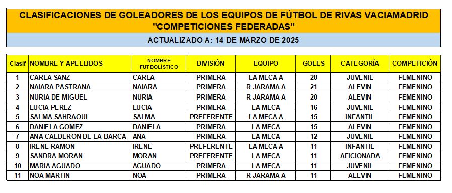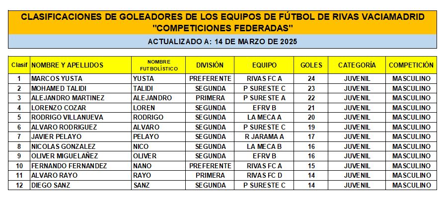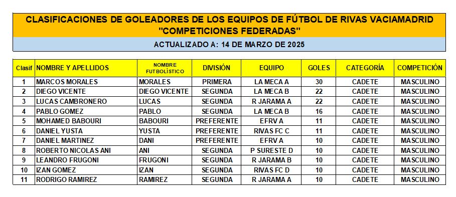 Las Clasificaciones están actualizadas a fecha del 14 de marzo de 2025. Incluyen a los equipos federados de Rivas Vaciamadrid.