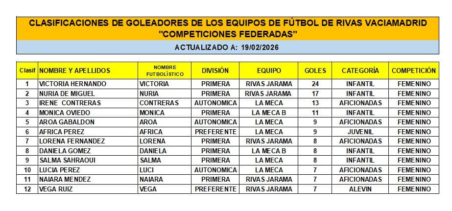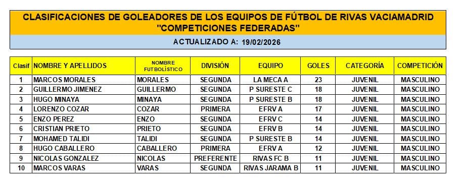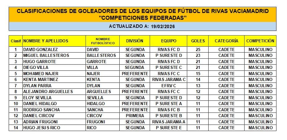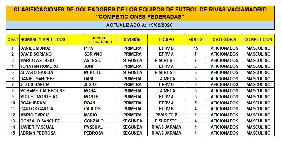 Las Clasificaciones están actualizadas a fecha del 15 de FEBRERO de 2026. Incluyen a los equipos federados de Rivas Vaciamadrid.