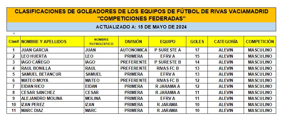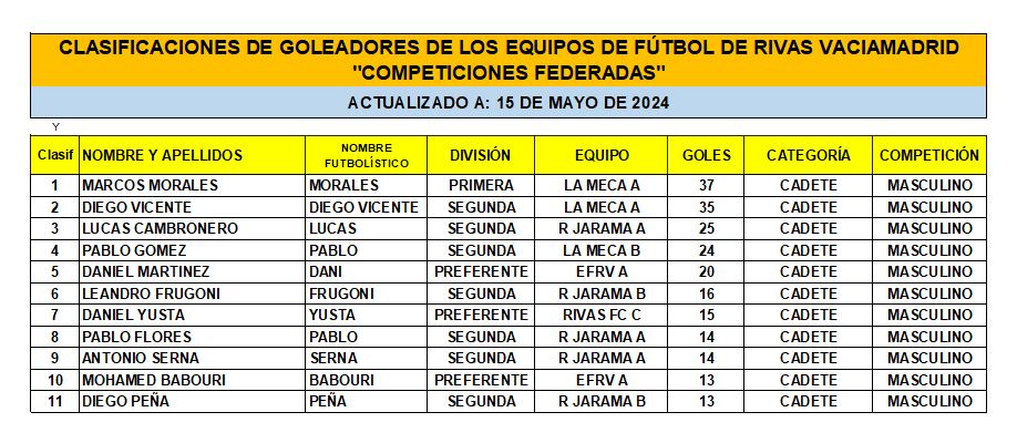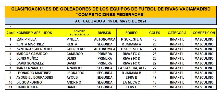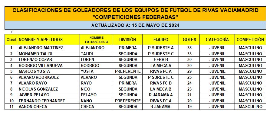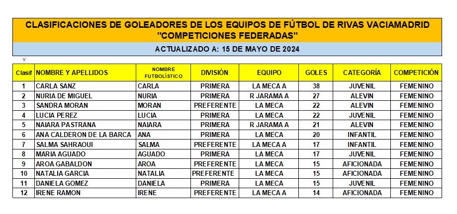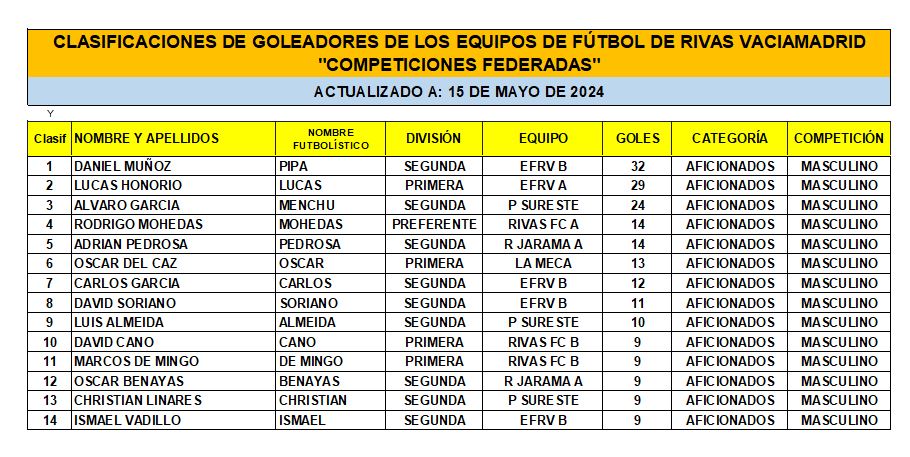 Las Clasificaciones están actualizadas a fecha del 15 de mayo de 2025. Incluyen a los equipos federados de Rivas Vaciamadrid.