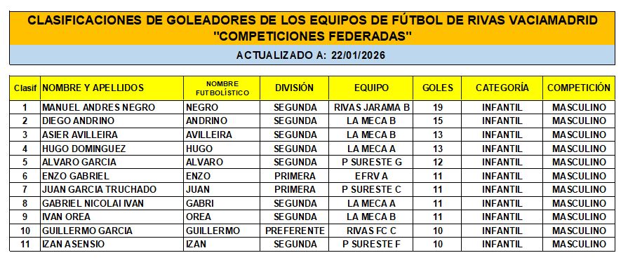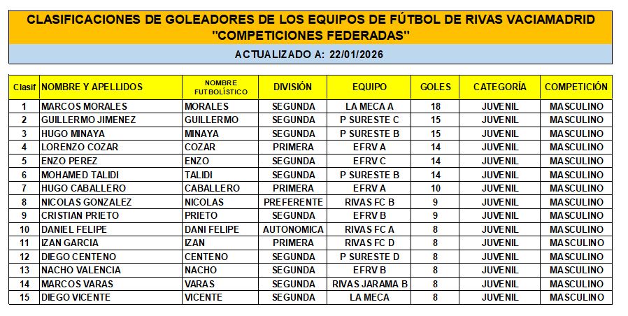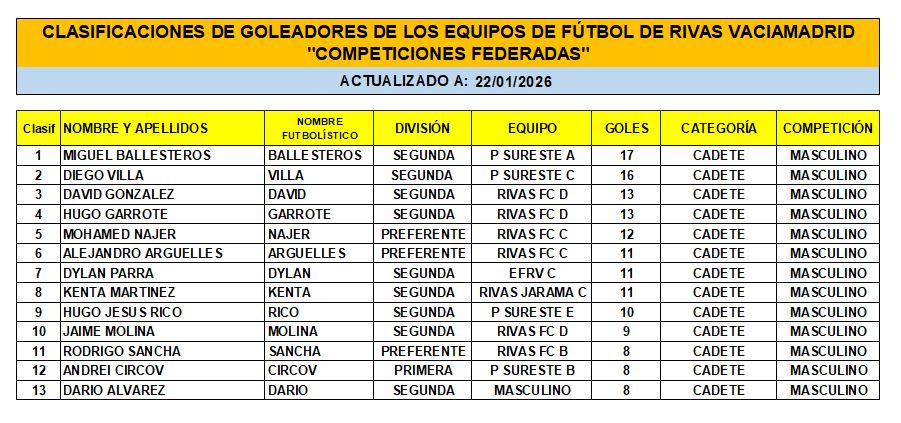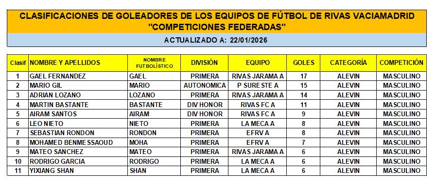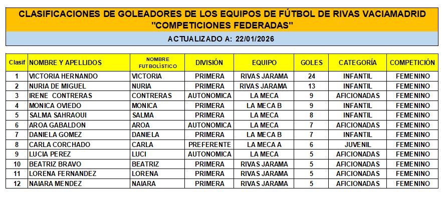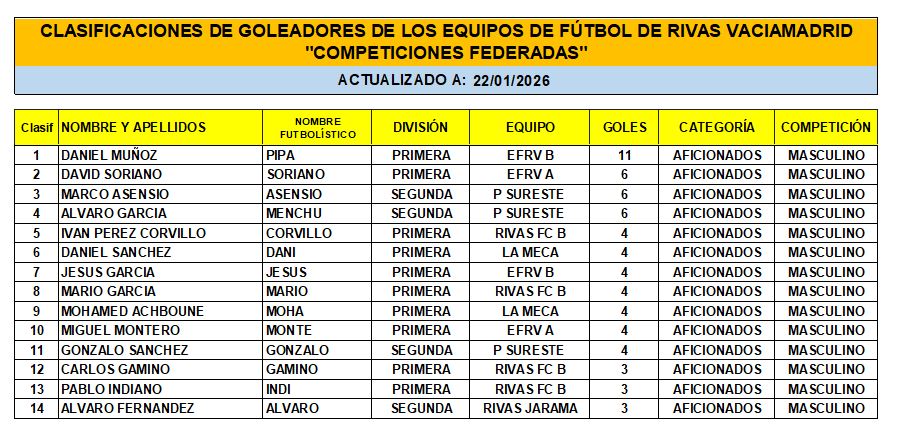 Las Clasificaciones están actualizadas a fecha del 18 de ENERO de 2026. Incluyen a los equipos federados de Rivas Vaciamadrid.