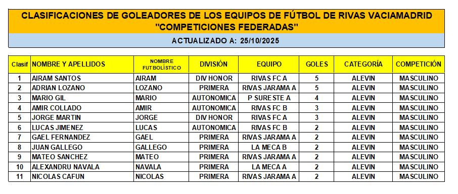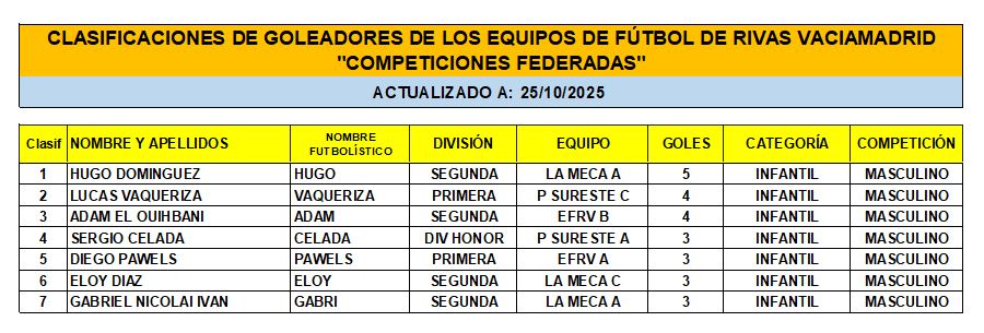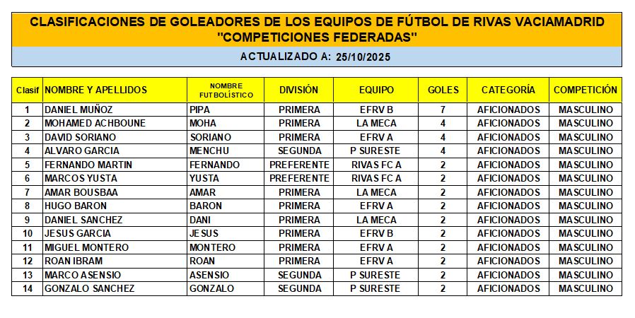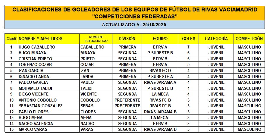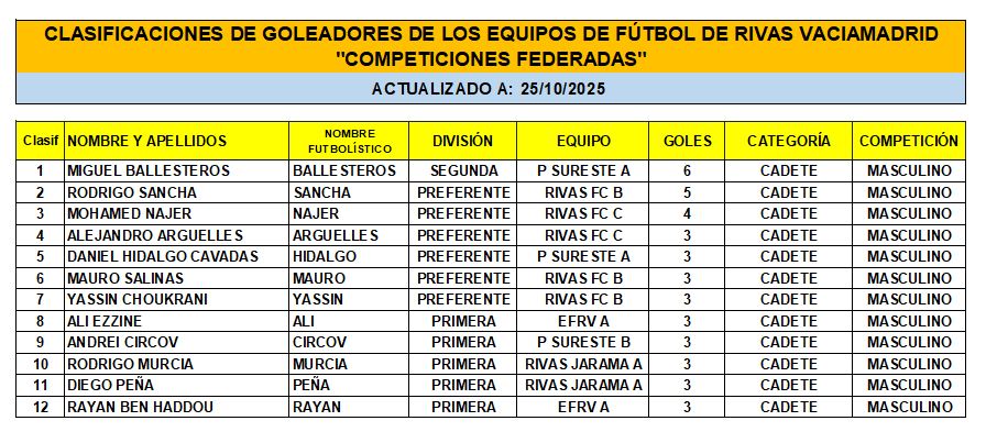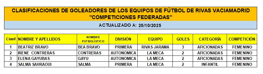 Las Clasificaciones están actualizadas a fecha del 19 de OCTUBRE de 2025. Incluyen a los equipos federados de Rivas Vaciamadrid.