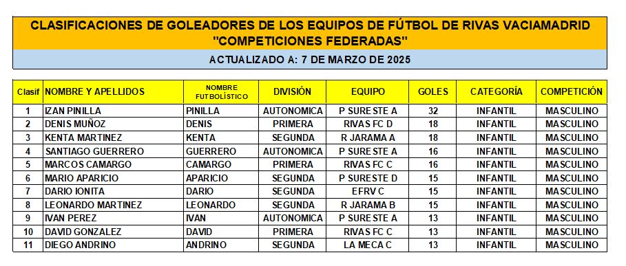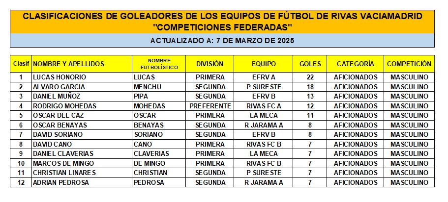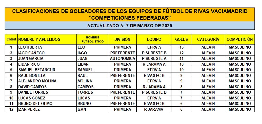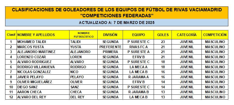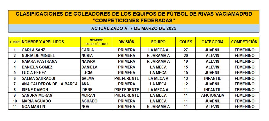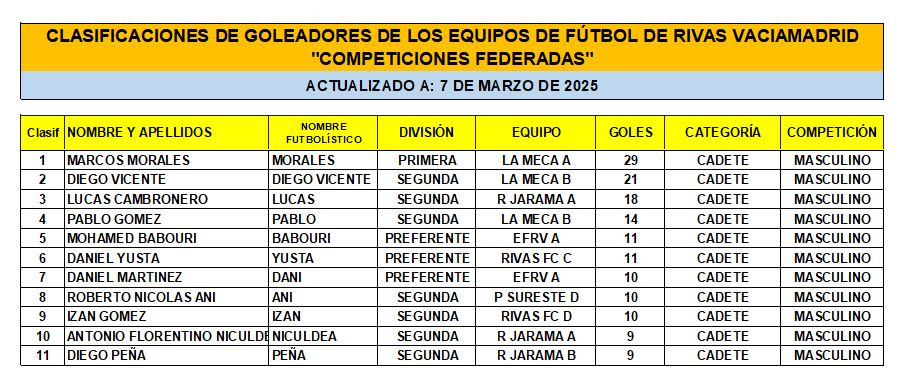 Las Clasificaciones están actualizadas a fecha del 7 de marzo de 2025. Incluyen a los equipos federados de Rivas Vaciamadrid.