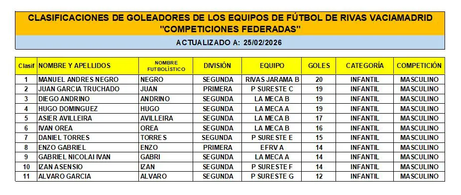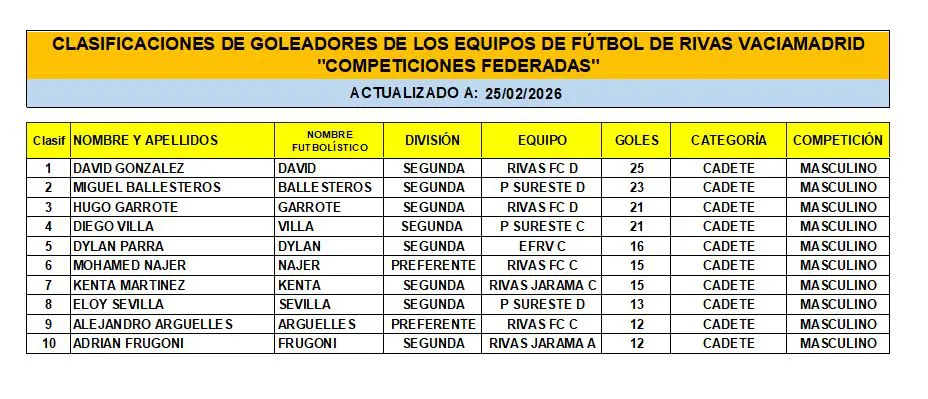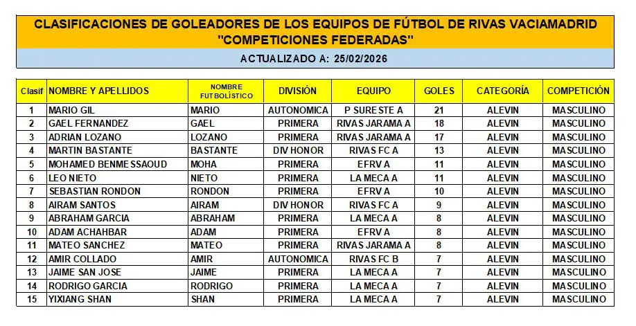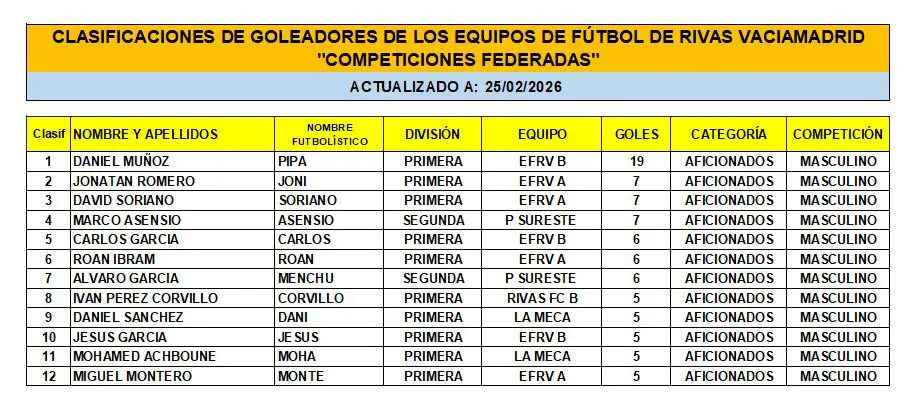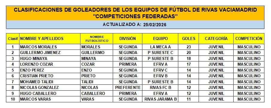 Las Clasificaciones están actualizadas a fecha del 22 de FEBRERO de 2026. Incluyen a los equipos federados de Rivas Vaciamadrid.