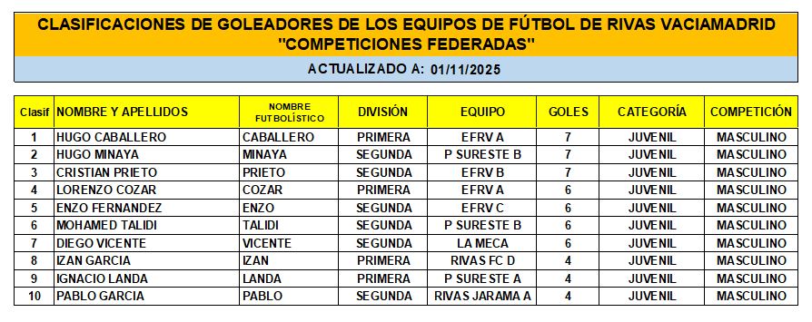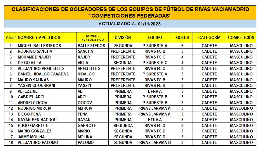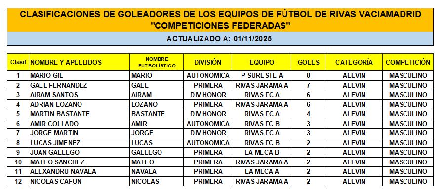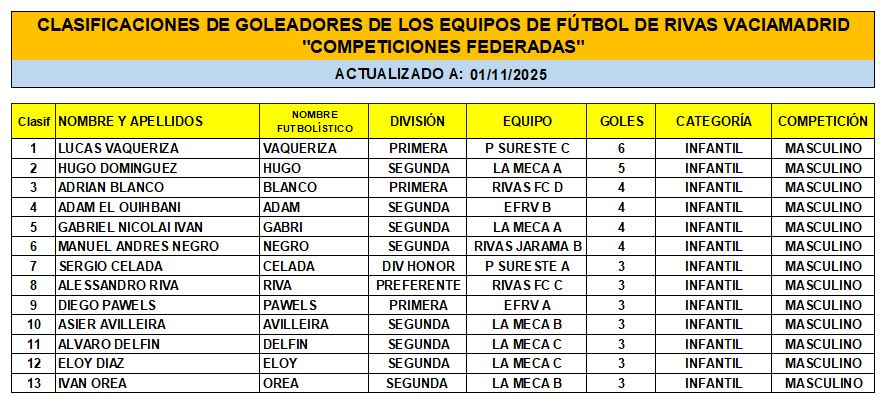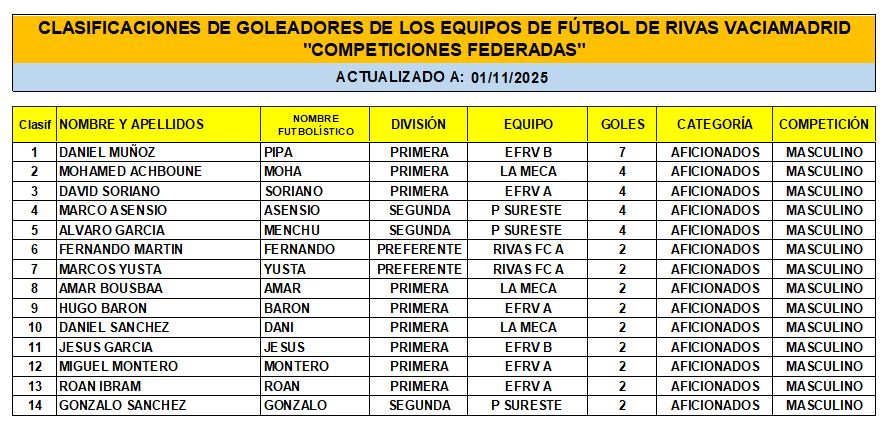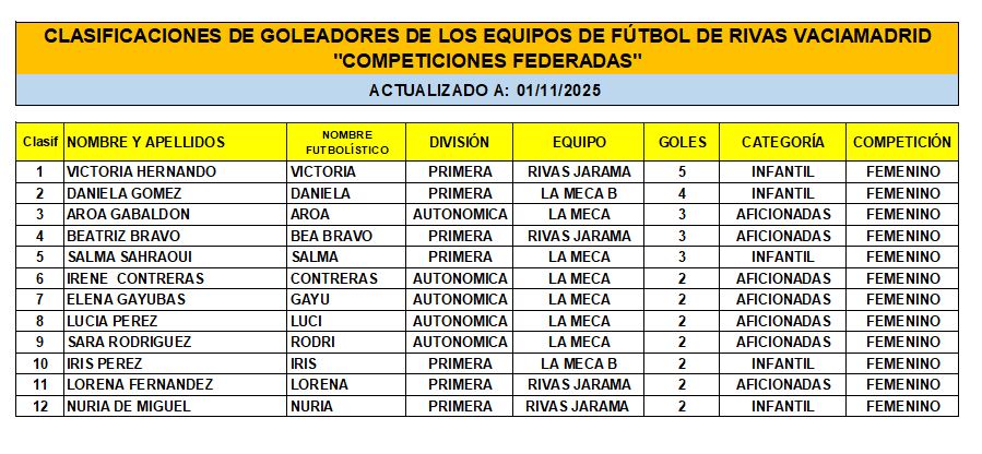 CLASIFICACIÓN DE LAS Y LOS GOLEADORAS/ES EN EL FUTBOL DE RIVAS VACIAMADRID A 26 DE OCTUBRE/25