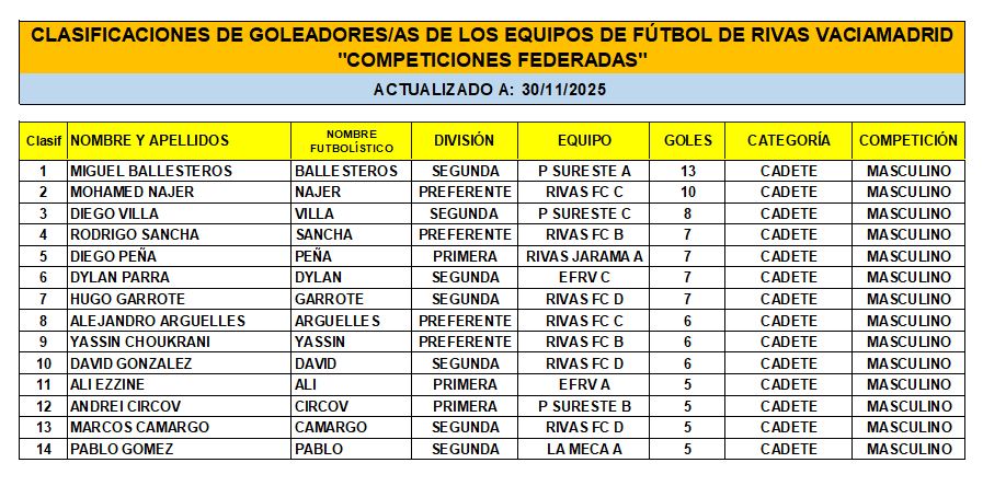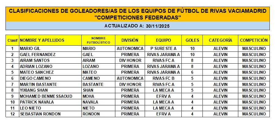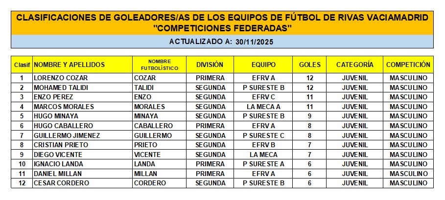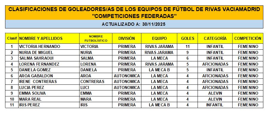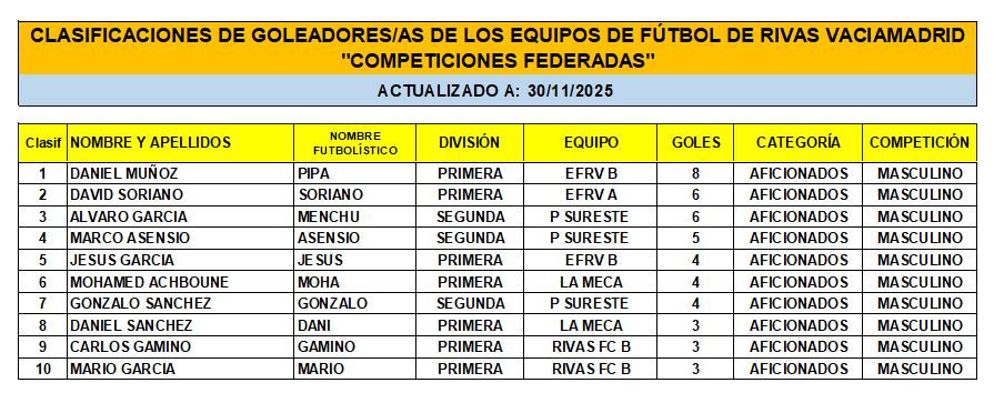 Las Clasificaciones están actualizadas a fecha del 28 de NOVIEMBRE de 2025. Incluyen a los equipos federados de Rivas Vaciamadrid.