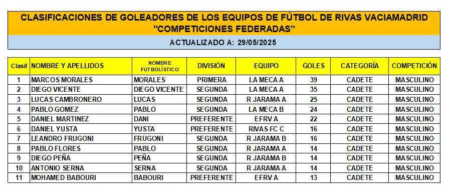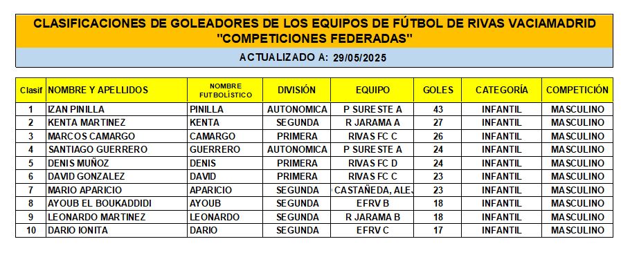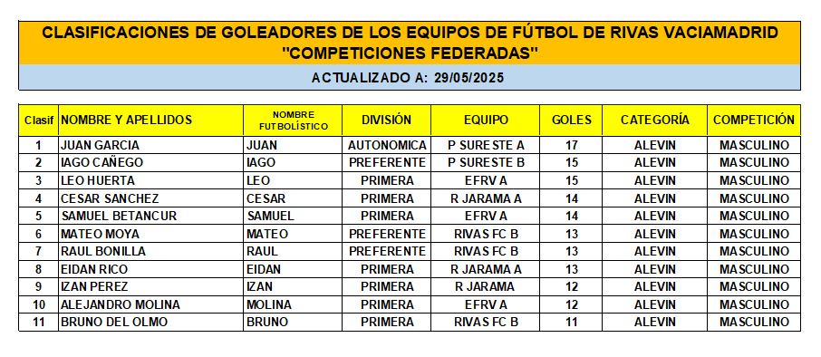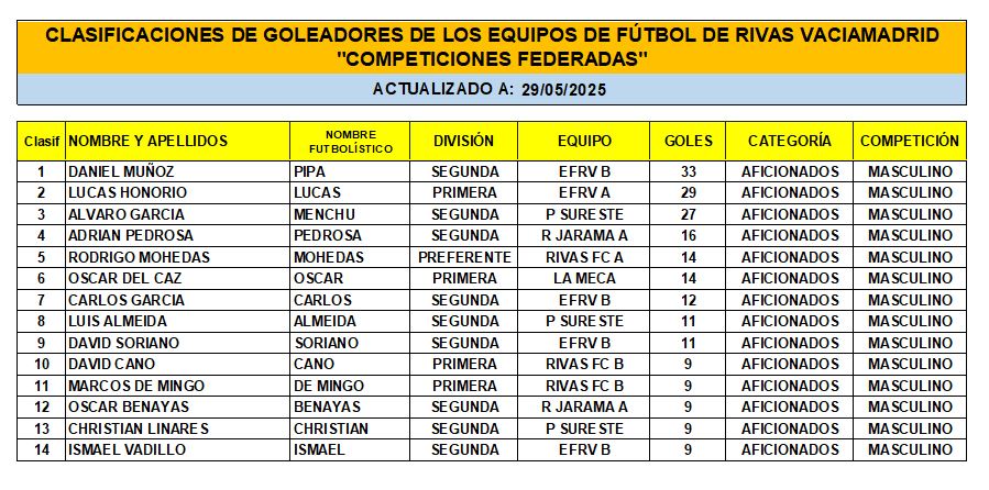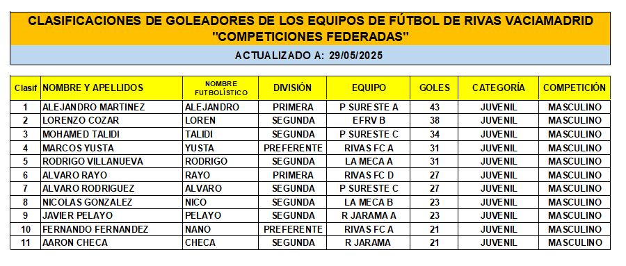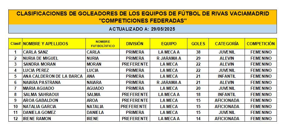 CLASIFICACIÓN DE LAS Y LOS GOLEADORAS/ES EN EL FUTBOL DE RIVAS VACIAMADRID A 29 DE MAY/25