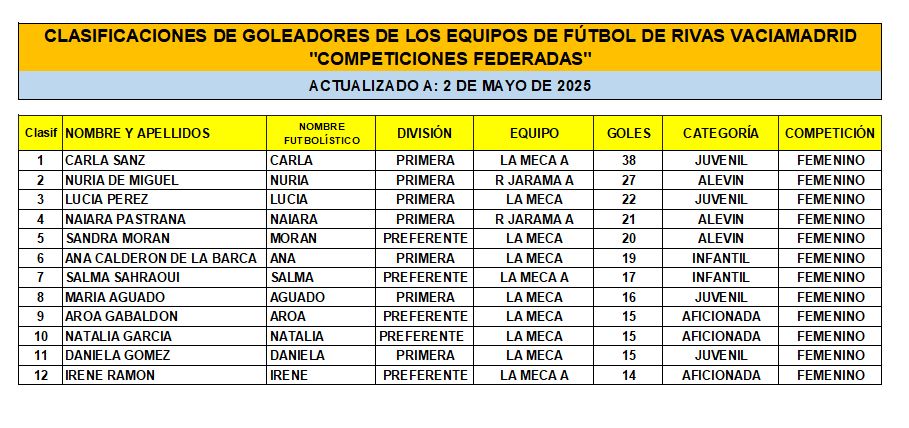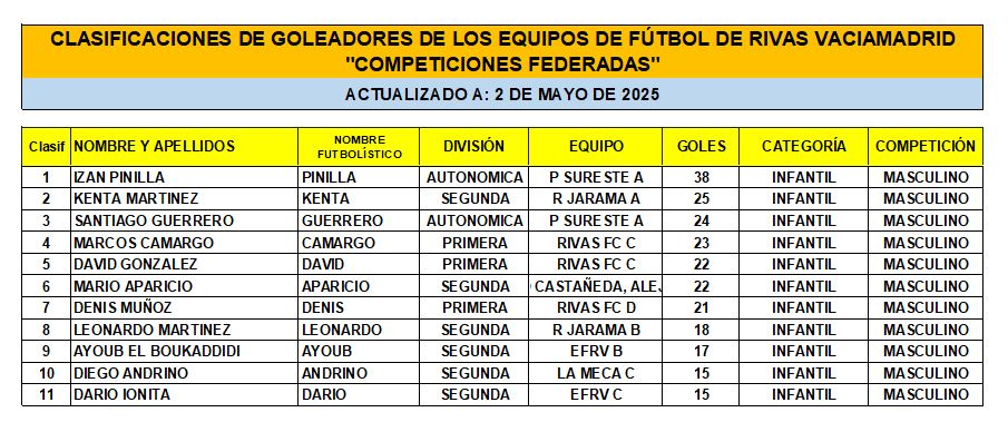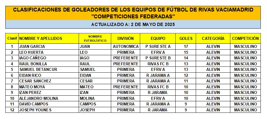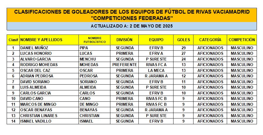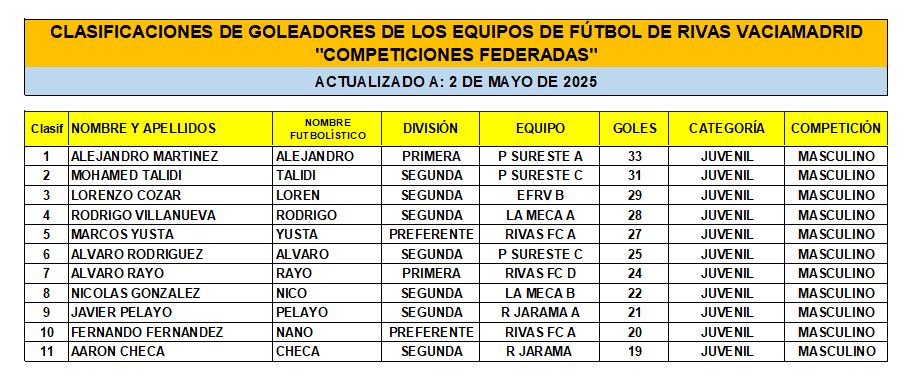Las Clasificaciones están actualizadas a fecha del 3 de mayo de 2025. Incluyen a los equipos federados de Rivas Vaciamadrid.