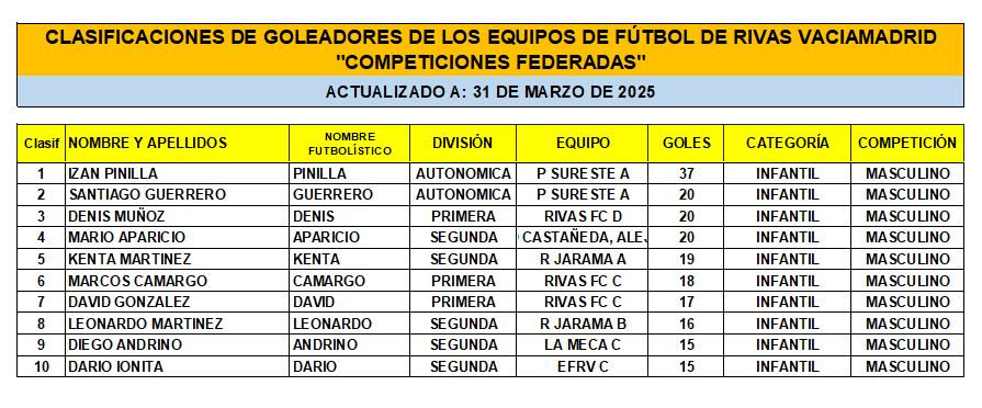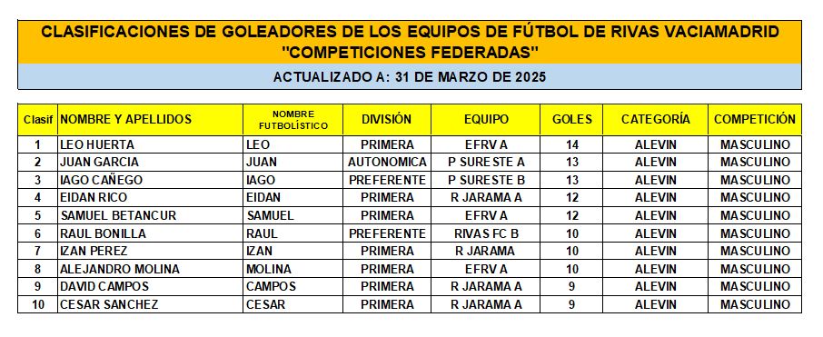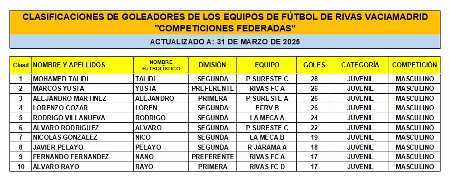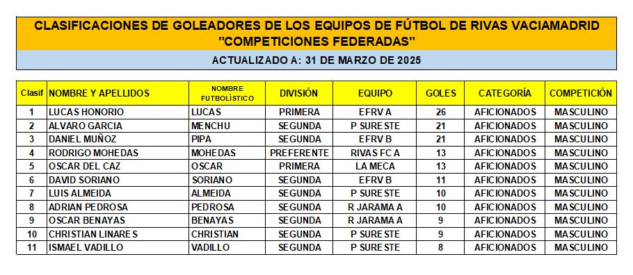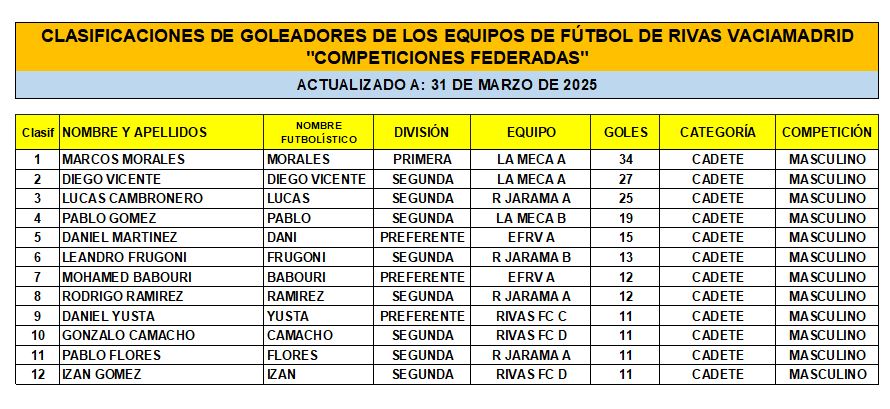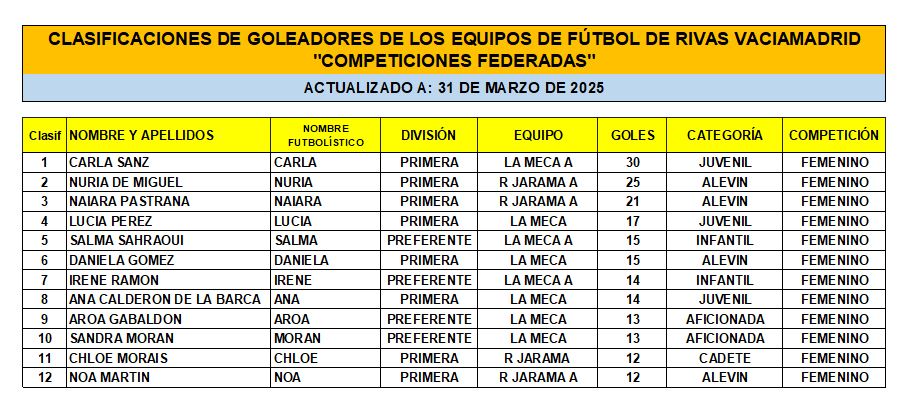 Las Clasificaciones están actualizadas a fecha del 31 de marzo de 2025. Incluyen a los equipos federados de Rivas Vaciamadrid.
