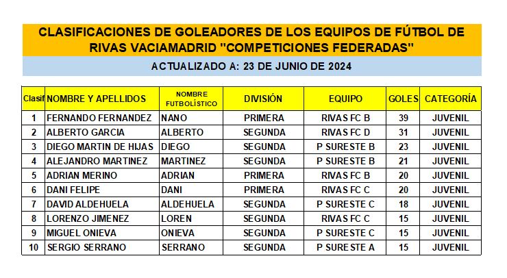 En juveniles el mejor artillero de todos ha sido Fernando Fernández, Nano, jugador del juvenil B del Rivas FC que ha sumado 39 goles superando en ocho a Alberto García del Rivas FC C que logró 31 y en tercera posición ha finalizado Diego Martín de Hijas del Parque Sureste B que ha logrado perforar las porterías contrarias en 23 ocasiones.