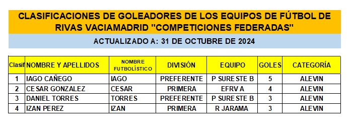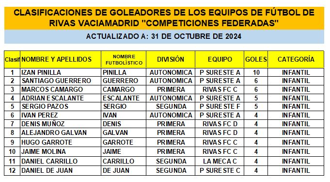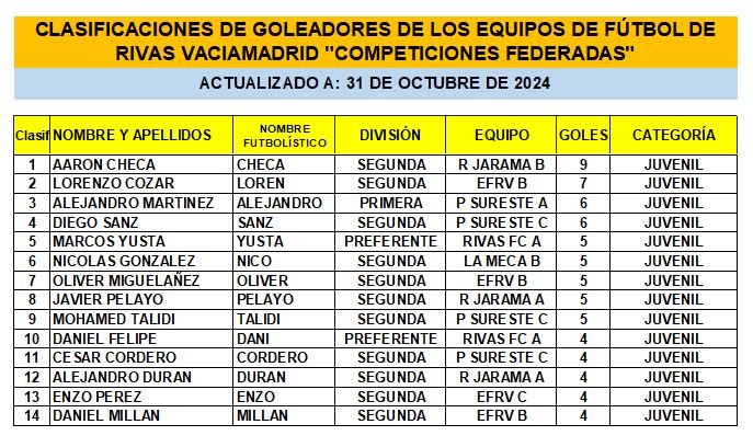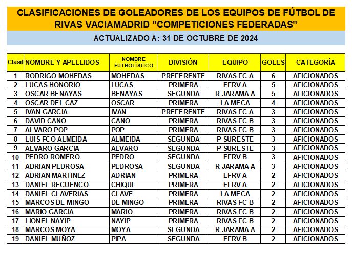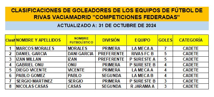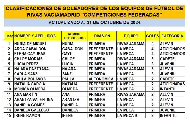 CLASIFICACIÓN DE LAS Y LOS GOLEADORAS/ES EN EL FUTBOL DE RIVAS VACIAMADRID 24/25