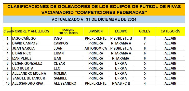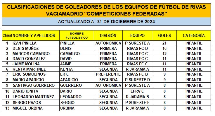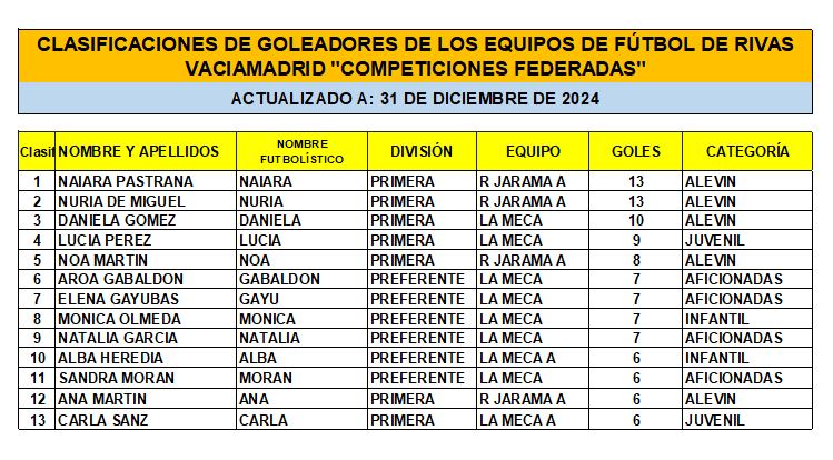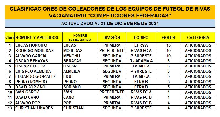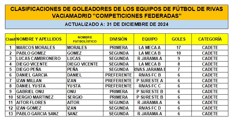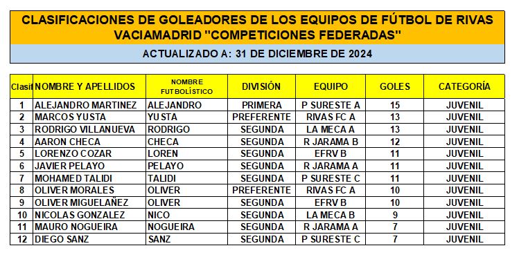 CLASIFICACIÓN DE LAS Y LOS GOLEADORAS/ES EN EL FUTBOL DE RIVAS VACIAMADRID A 31 DE DIC/24