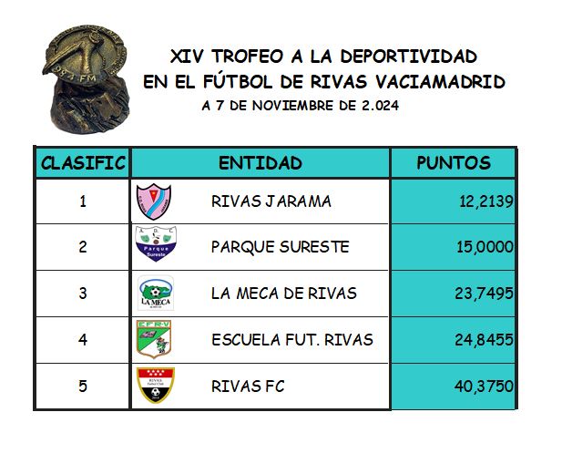 - LA ESCUELA DE FÚTBOL DE RIVAS NO HA TENIDO NINGUNA SANCIÓN EN ESTA SEMANA Y ES LA QUE RECORTA CON TODOS SUS RIVALES EN LA CLASIFICACIÓN.