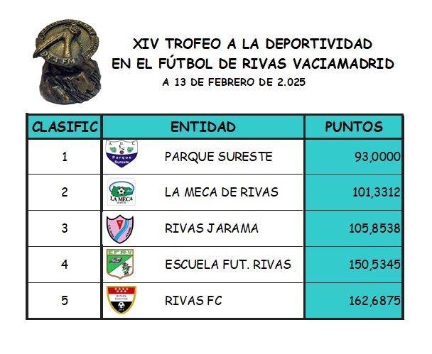 - Rivas Jarama es tercero con La Escuela de Fútbol en cuarta posición y Rivas FC que solo tiene una sanción a un alevín es el último en esta clasificación.