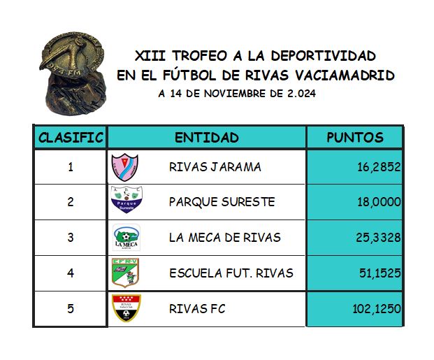 - La clasificación no cambia con Rivas Jarama en primer lugar, Parque Sureste segundo muy cerca y La Meca tercero. La Escuela es cuarto bastante lejos de las tres primeras plazas y el Rivas FC en quinto lugar con mucha distancia sobre el resto.