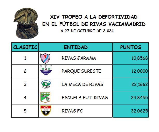 - La Meca y La Escuela intercambian las posiciones y el Rivas Jarama sigue como líder de la clasificación de la deportividad pero eso si muy cerca del Parque Sureste que es segundo.