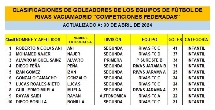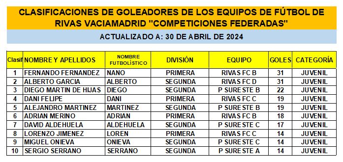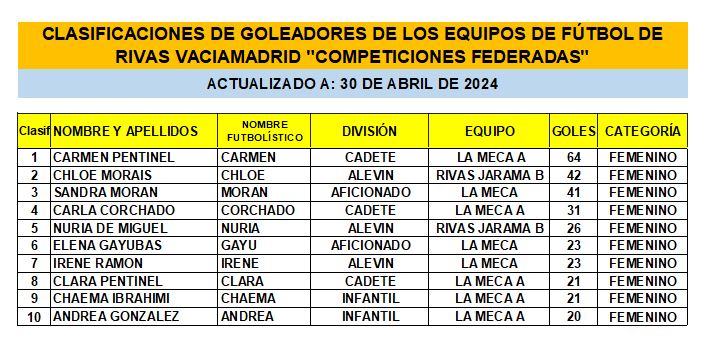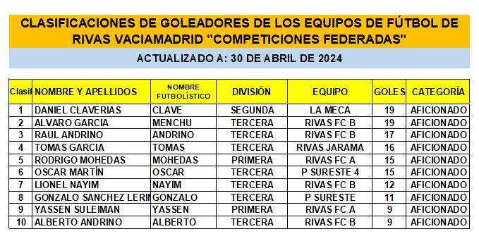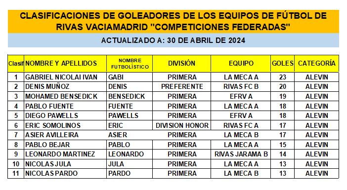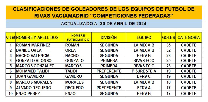 CLASIFICACIONES DE GOLEADORES DE LOS EQUIPOS DE FÚTBOL DE RIVAS VACIAMADRID «COMPETICIONES FEDERADAS» 30-04-24