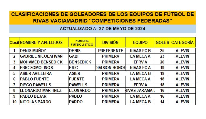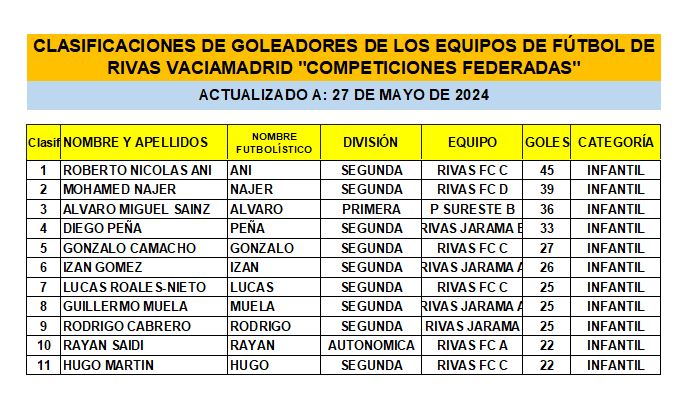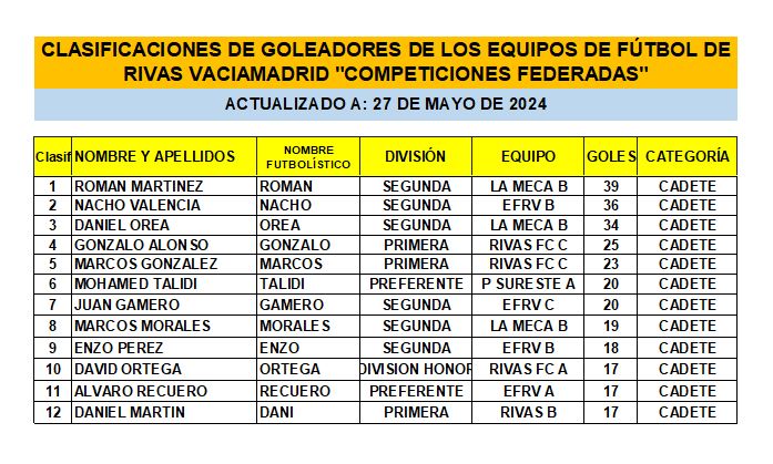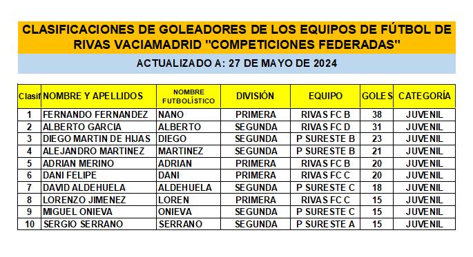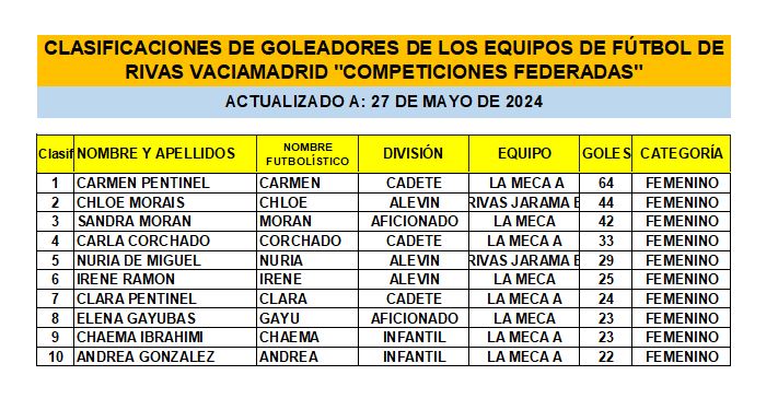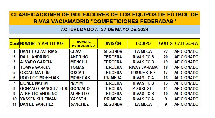 CLASIFICACIONES DE GOLEADORES DE LOS EQUIPOS DE FÚTBOL DE RIVAS VACIAMADRID «COMPETICIONES FEDERADAS» 27-05-24