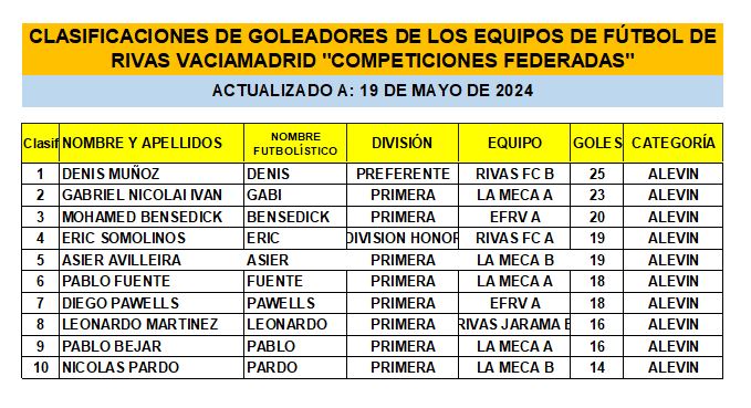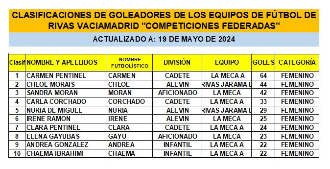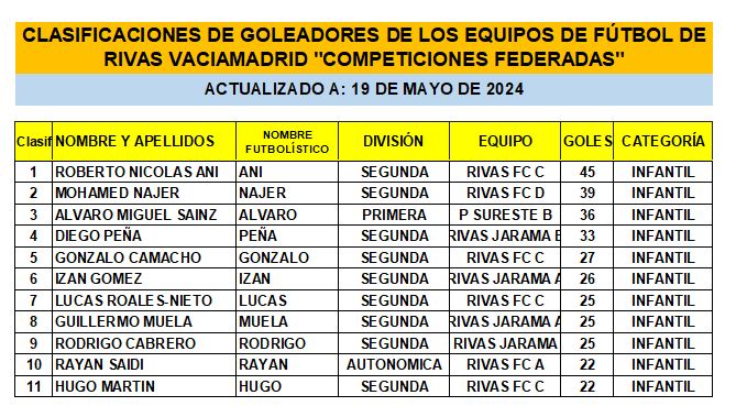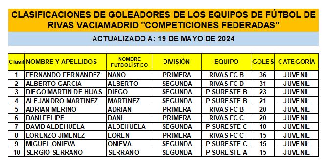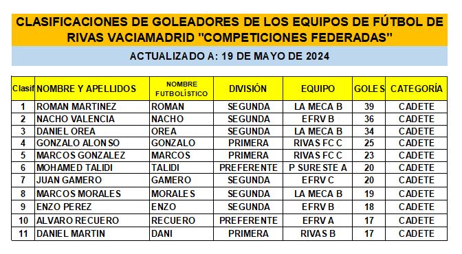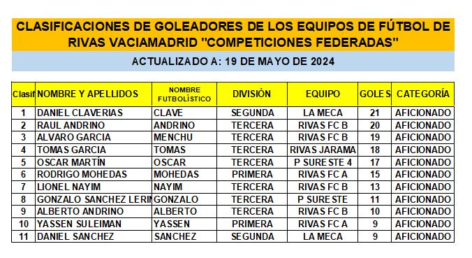 CLASIFICACIONES DE GOLEADORES DE LOS EQUIPOS DE FÚTBOL DE RIVAS VACIAMADRID «COMPETICIONES FEDERADAS» 19-05-24