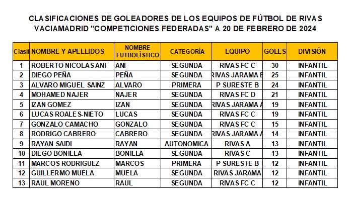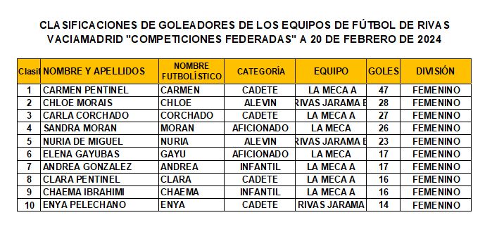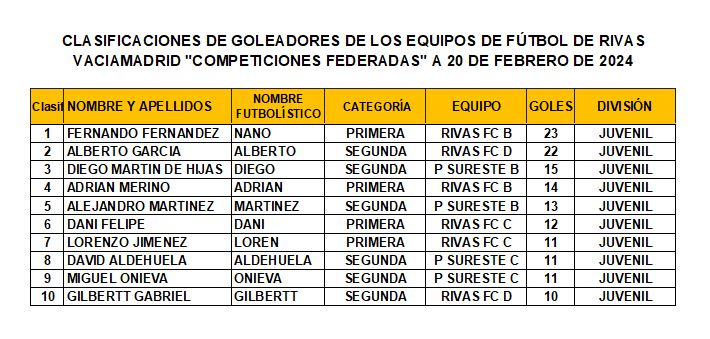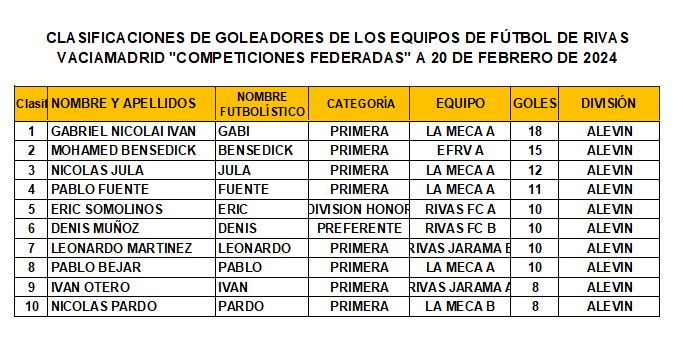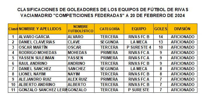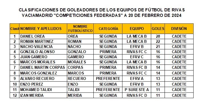 CLASIFICACIONES DE GOLEADORES DE LOS EQUIPOS DE FÚTBOL DE RIVAS VACIAMADRID «COMPETICIONES FEDERADAS» 21-02-24