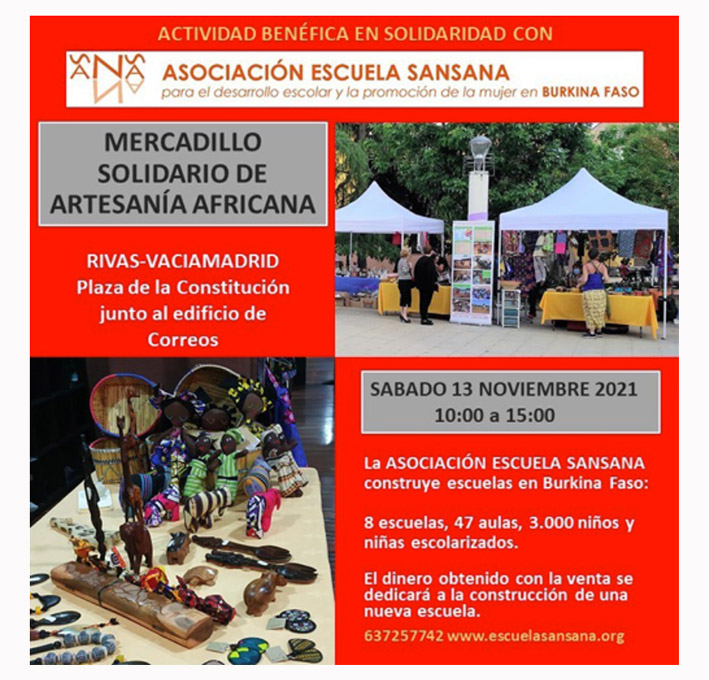 Escuelas Sansana, ONG que trabaja la solidaridad en Burkina Faso, realizará un mercadillo solidario que se va a instalar el próximo sábado 13 de noviembre de 10:00 h a 15:00 h en la plataforma detrás de Correos, entre el mercadillo y Plaza la Constitución.