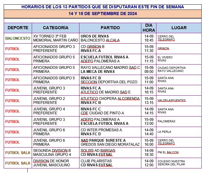 HORARIOS DE 13 EVENTOS DEPORTIVOS A CELEBRAR LOS DÍAS 14 Y 15 DE septiembre-2024 POR ENTIDADES DEPORTIVAS FEDERADAS DE RIVAS VACIAMADRID.