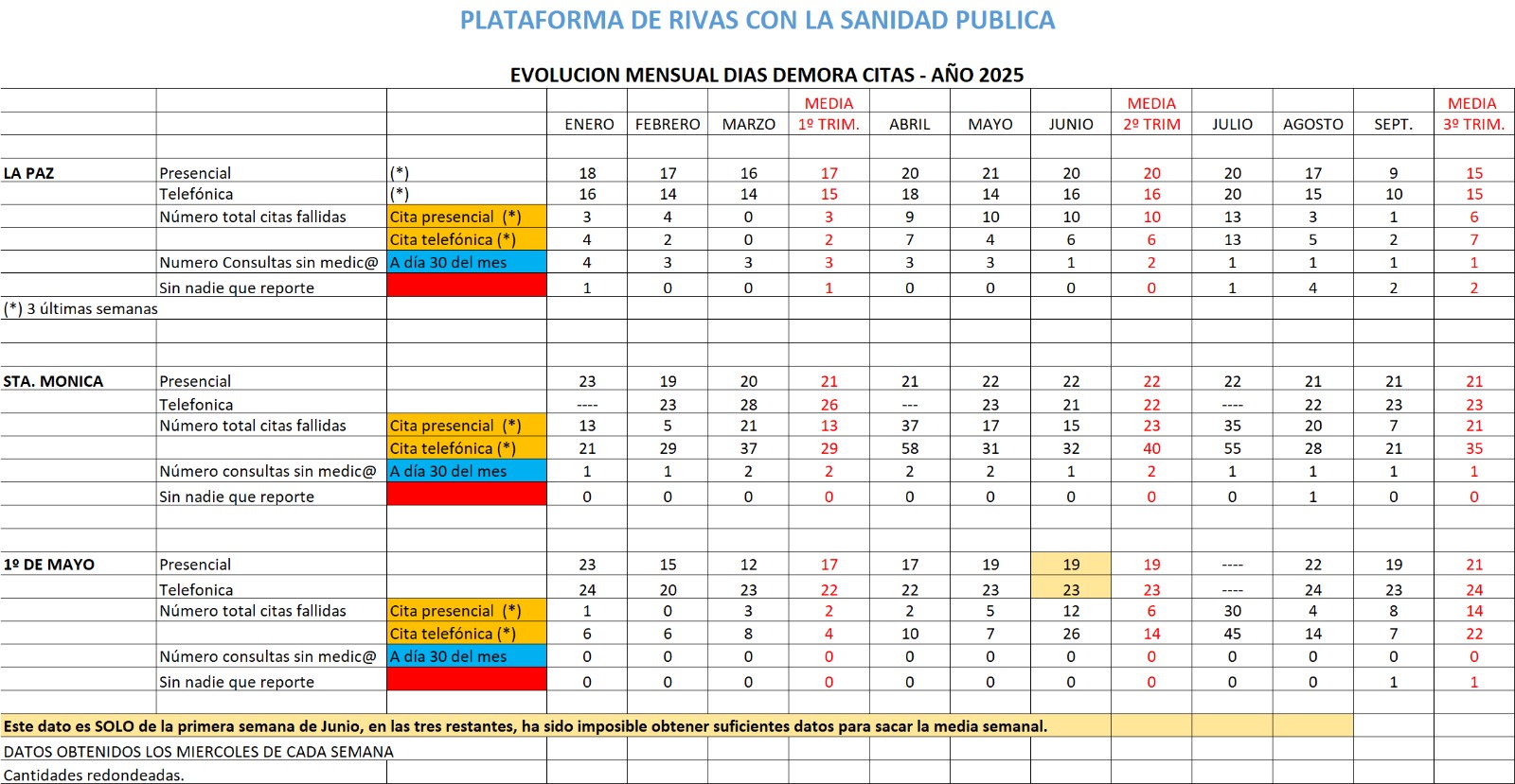 La Plataforma Rivas con la Sanidad Pública sigue recogiendo datos, semanalmente, sobre las demora en las citas de Atención Primaria.