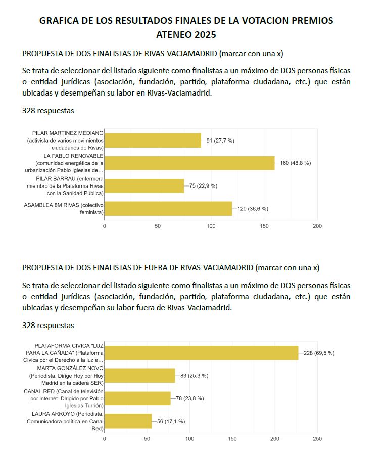 Gráficos de las votaciones), en la cual informamos a los vecinos y vecinas de Rivas la elección mediante votación popular de las entidades premiadas en la presente edición de los Premios Ateneo.