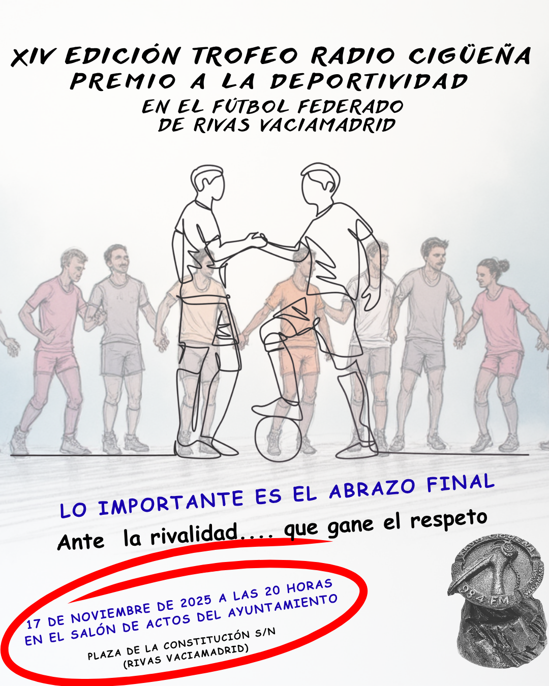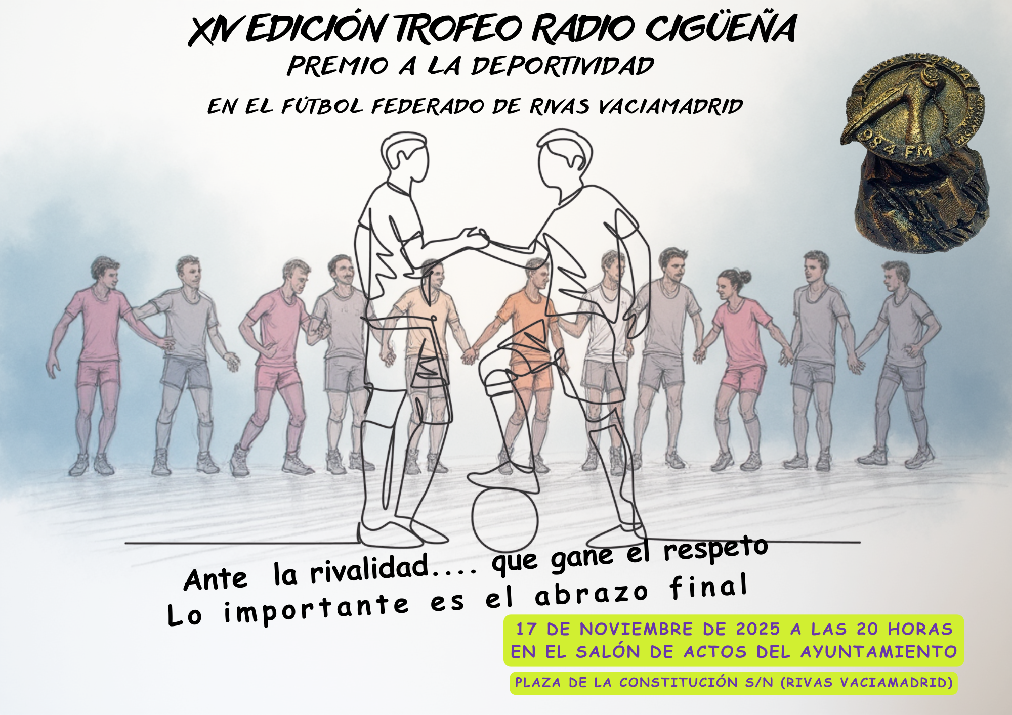 Este próximo lunes, 17 de noviembre, a las 20:00 horas, el salón de actos del Ayuntamiento de Rivas Vaciamadrid acogerá la gala de entrega del XIV Trofeo a la Deportividad Radio Cigüeña. Este evento tiene como propósito reconocer y premiar a la entidad futbolística federada más deportiva del municipio durante la última temporada.